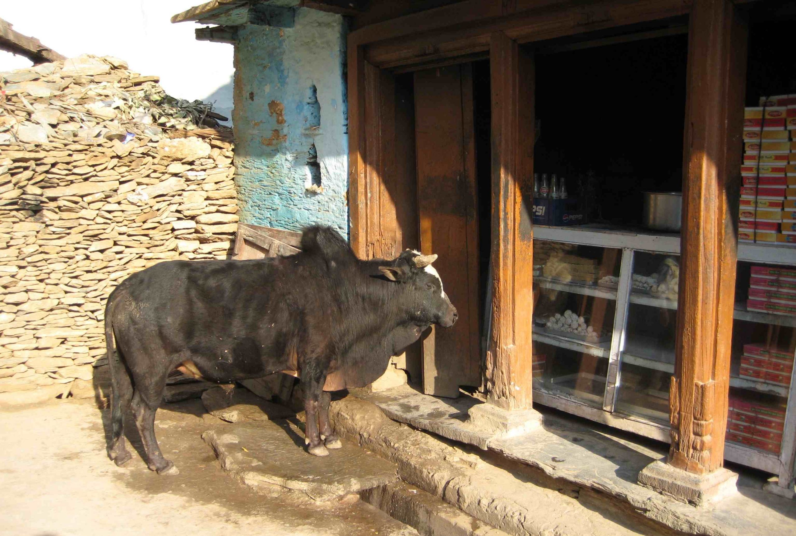 Das Restaurant, in dem in den nächsten 4 Tagen das Essen für uns zubereitet wurde, befand sich am anderen Ende der Stadt, so dass wir immer ca. eine halbe Stunde durch die engen Gassen und Sträßchen gehen mussten, bis wir die Nahrungsquelle erreichten. Das war jedoch sehr aufschlussreich, denn dadurch konnten wir Einblicke in das Leben der Bewohner und in die Kultur der Region zu unterschiedlichen Tageszeiten gewinnen. Uns beeindruckte natürlich, mit was für einem Respekt man den Tieren hierzulande begegnete und wie man sie mit allerlei Köstlichkeiten verwöhnte… sogar in einer Bäckerei…