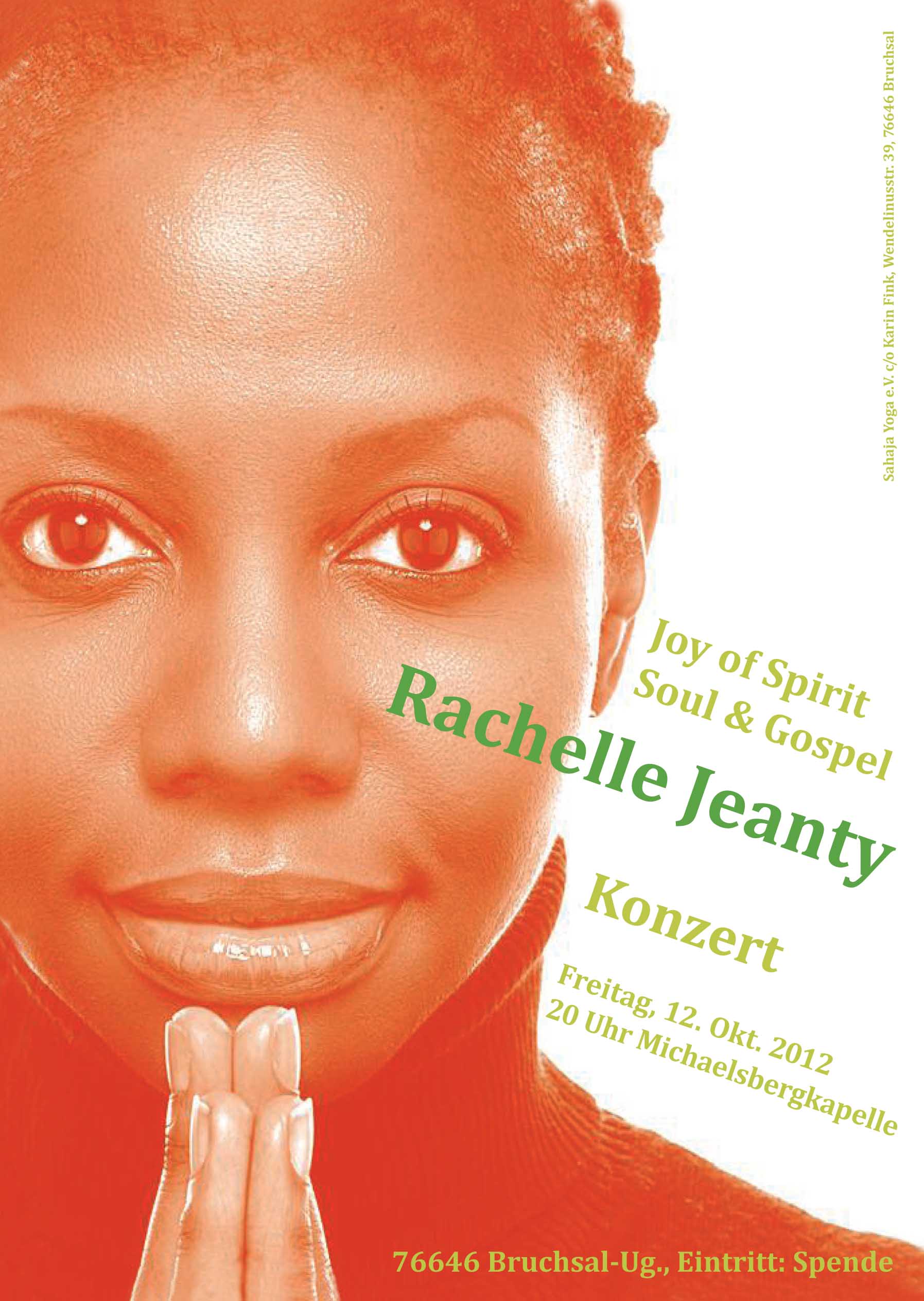 Ihr Konzert in New York vor 2500 begeisterten Besuchern fand zum Gedenken an die Opfer der Sklaverei statt. Die Sängerin ist in Haiti geboren, in New York und Montreal aufgewachsen und lebt derzeit in Berlin. Ihre Muttersprache ist Französisch. Sie wird in ihrem Konzert neben Klassikern aus Soul, Pop und Gospel auch eigene Lieder aus ihrem neuen Album D’ÂME SOUL singen. Es erwartet Sie ein Programm mit spirituellem und philosophischem Hintergrund in dem Sie durchaus auch populären Songs finden werden.