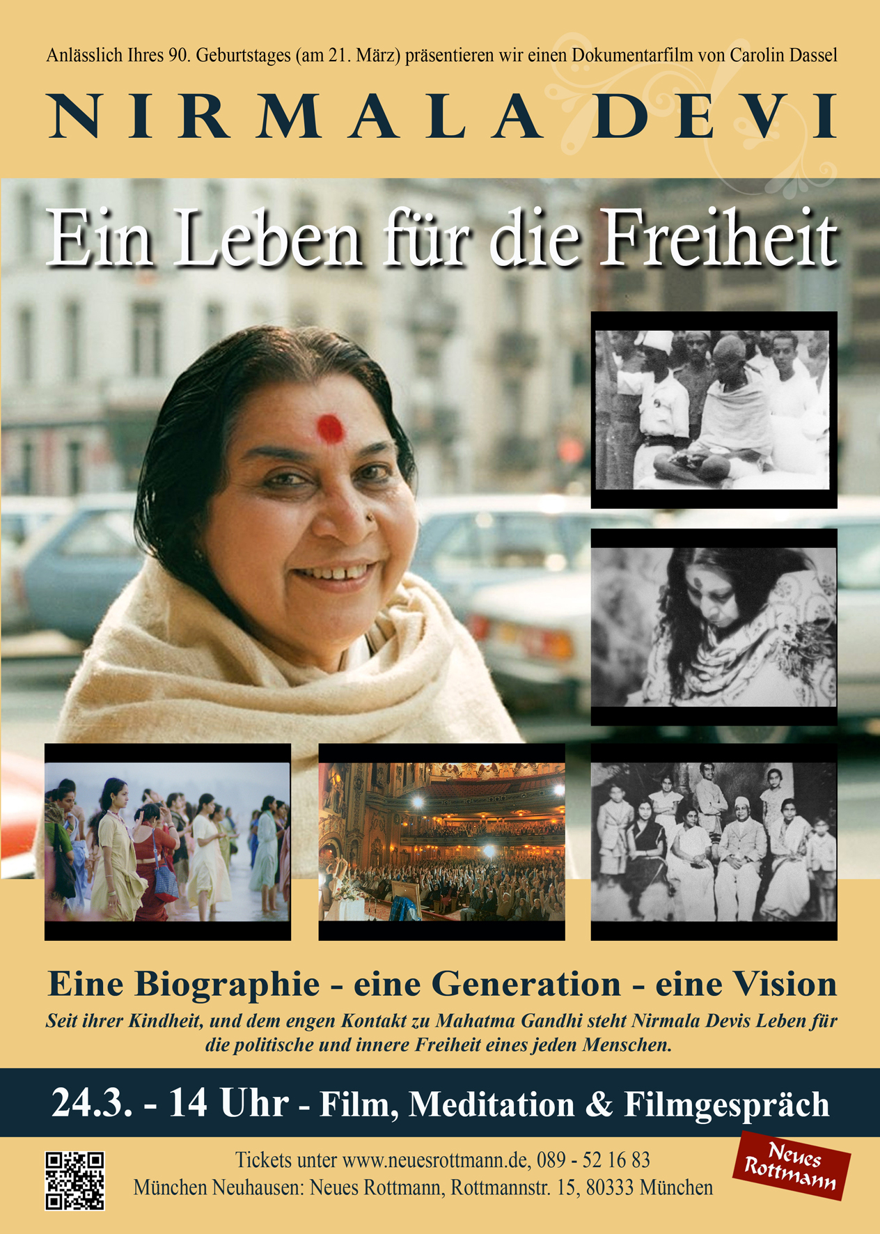 Am 21. März wäre Shri Mataji 90 Jahre alt geworden. Der Begründerin von Sahaja-Yoga zu Ehren wird am 24.3. der Dokumentarfilm “Nirmala Devi – Ein Leben für die Freiheit“ gezeigt. Vor dem Film gibt es eine kurze Einführung in die Sahaja Yoga Meditation und anschliessend folgt ein Filmgespräch mit der Regisseurin und Produzentin Carolin Dassel.